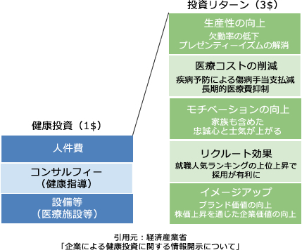 ジョンソン・エンド・ジョンソンが世界250社・約11万4000人の従業員に健康教育プログラムを提供した投資リターンを試算した結果「1ドルの健康投資に対して約3ドルの成果に繋がった」と発表しています。